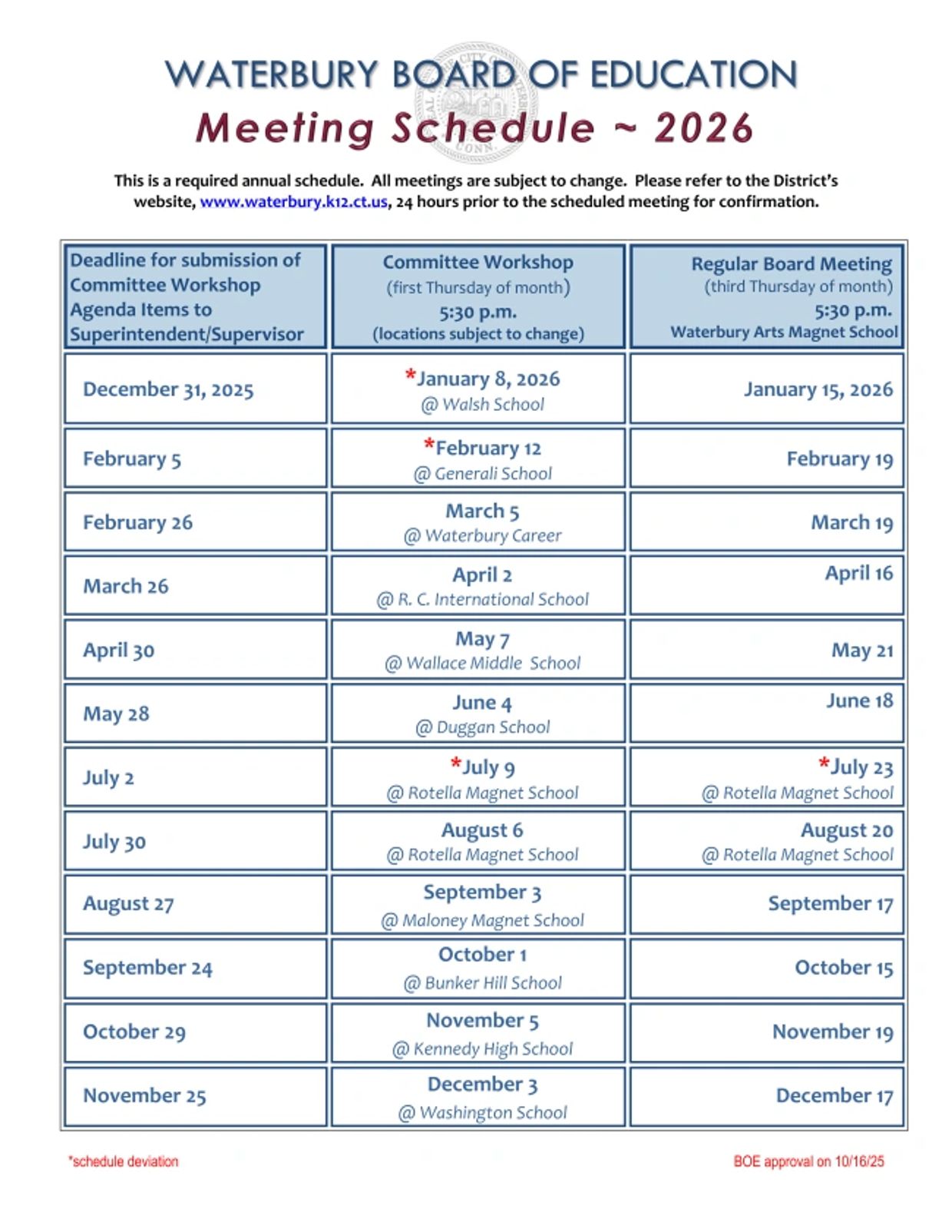 ***NOTE: On occasion grievance meetings will be cancelled due to holidays or other unforeseen events. Building Reps will be contacted via email in the event of an unforeseen cancellation.